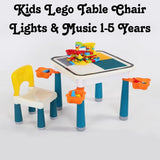 - This Kids Baby Boy Girl Blocks Lego Table Chair is the perfect addition to your child's playroom. With its colorful blocks and fun design, it will keep your little one entertained for hours. The table and chair set comes with built-in lights and music, adding an extra element of excitement to playtime. It's great for early learning and developing fine motor skills. The sturdy construction ensures that it will last through all the rough and tumble play. This set is suitable for both boys and girls and is sure to be a hit with any young child.